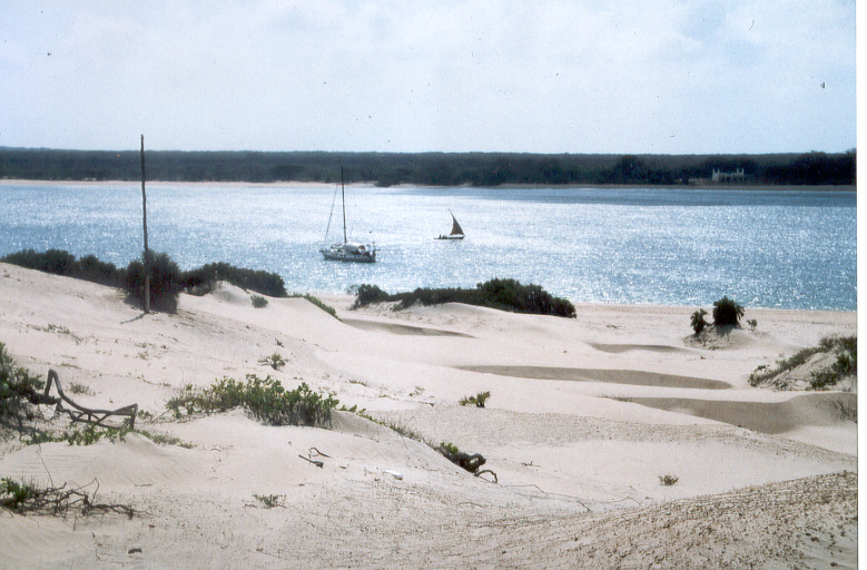 Da nun der Äquatorialstrom, der auf die Küste prallt, mit 4 Knoten von Süd nach Nord setzt, würde ich nicht einmal Lamu erreichen. In Panik nahm ich den Motor zur Hilfe und steuerte ununterbrochen 45 Stunden von Hand, da der Windpilot unter Motor nicht funktionierte. Der Sturm wurde immer stärker, die Wellen immer höher, desto mehr ich mich der Küste näherte. Nachts um 24 Uhr war ich dann in der Bucht von Lamu, in die genau der Sturm reinblies. Ich hatte keine Detailkarte, Einfahrtslichter brannten nicht und ein Notruf auf Kanal 16, wurde nicht gehört. Die Wellen hatten sich durch das seichtere Wasser in der Bucht, auf eine Höhe von 10 Meter aufgeschaukelt und die Yacht wurde einige Male mit dem Masten auf das Wasser gelegt. Um mich herum herrschte Weltuntergangstimmung. Jeglicher Versuch wieder aus dem Hexenkessel zu entfliehen, scheiterte an den hohen Brechern. Bevor ich wieder auf ein Riff geschleudert würde, warf ich in Panik 2 Anker. Ein Hexenschuss, hervor gerufen durch Unterkühlung, warf mich dann gänzlich aus der Bahn. Bis zum Morgengrauen, in brodelnder See, quälten mich dann noch zusätzlich, fürchterliche Magenschmerzen.