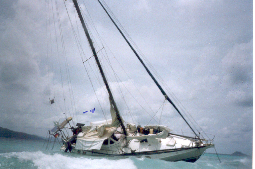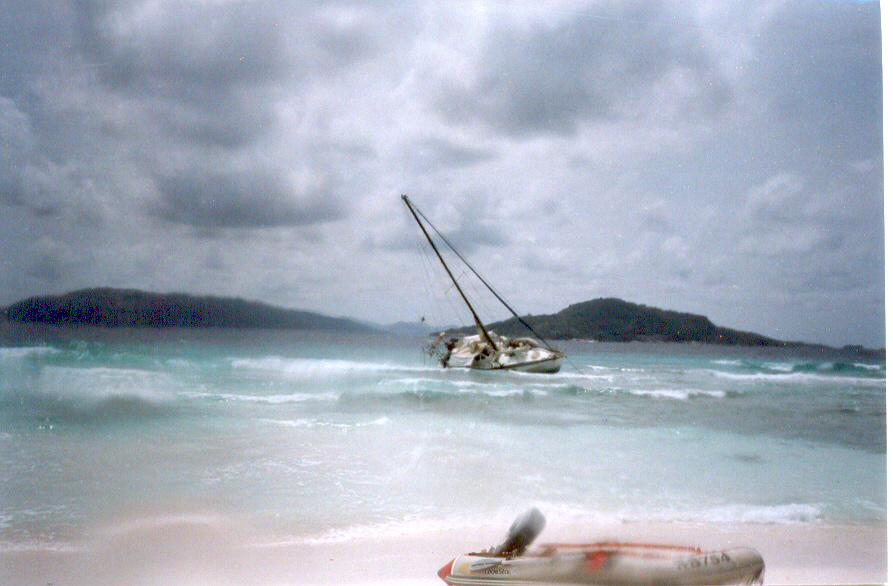Als meine Gäste Mitte Januar die Bavaria verließen, nahm ich in der selben Nacht noch Kurs auf die Seychellen. Vor der Einfahrt nach Daressalam (Tansania) rammte mich fast ein Frachtschiff, dessen Backbordlicht nicht brannte. Mit 4 Knoten hart am Wind und rauer See, kämpfte sich die Bavaria nach Osten. Am übernächsten Tag, war plötzlich der Wind weg und ich musste den Motor zu Hilfe nehmen. 35 Stunden lief die Yacht, bei arschglatter See nach Nord-Osten um in den Gürtel des NO-Monsuns zu kommen. Einem Trennstrich gleich, war der Wind plötzlich wieder da. In flotter Fahrt bewältigte ich die 1000 Sm lange Strecke, in 8 Tagen. Vier Tage später, kamen schon Freunde aus meiner Heimatstadt Roding und gleich danach, 4 Gäste aus Berlin. Anfänglich etwas skeptisch wegen dem Kultur-unterschied, entpuppten sie sich als ganz liebe und zugängliche Gäste. Die erste Woche verlief harmonisch, bis zu Beginn der 2. Woche der Satan einen Riegel vorschob. Als wir vor der unbewohnten Insel Marianne ankerten, drehte plötzlich der Wind auf Legerwal und wir wollten Anker auf gehen. Beim Einholen der Kette kam sie kurzstag und der Schäkel am Anker brach. Durch den hohen Schwell strandete die Bavaria sofort auf dem Riff. Auf meinen Hilferuf über UKW erfolgte keinerlei Reaktion. 8 Stunden arbeiteten Peter und ich in tosender Brandung. Wir holten uns Abschürfung, und Prellung ein, um das Schiff vor Totalverlust zu retten. Doch alles war vergebens.