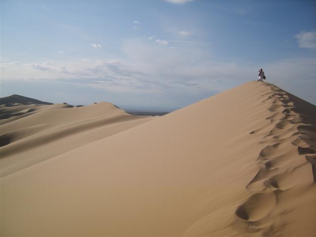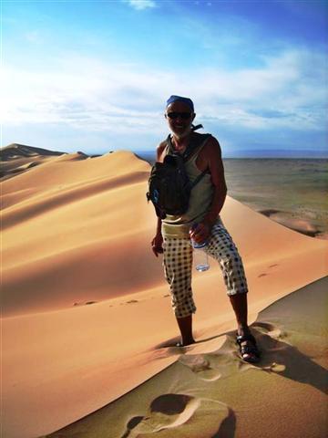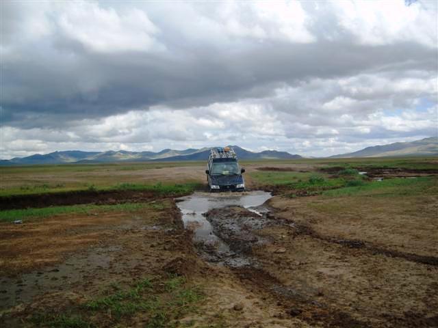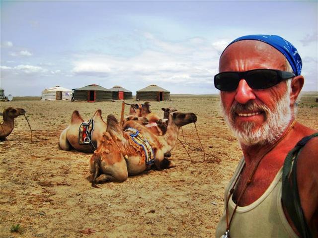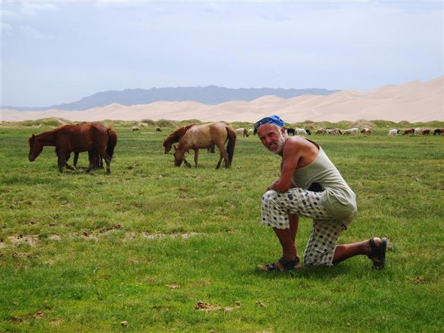 Von dort aus reiste der Abenteurer mit einem russischen Allrad in die Wüste Gobi. Tagelang durchquerte er die unglaublich vielfältige, flächenmäßig zweitgrößte Wüste der Erde und übernachtete dabei stets in den Jurten der Beduinen. Noch nie in seinem Leben hatte er so viele Tiere, Blumen und eine so prächtige Natur gesehen. Mit Pferden ritt er in die von Gletschern durchzogenen Berge und durchquerte reißende Flüsse. Wieder auf vier Rädern unterwegs war es keine Seltenheit, dass das Auto mit der Winde aus dem Dreck gezogen werden musste. Gefährlich wurde es, als sein Toyota in eine Schlucht rutschte, sich aber wie durch ein Wunder nicht überschlug. Zudem war ständig Bedarf an Reparaturen, der Tank hatte ein Loch, gefolgt von drei Reifenpannen.